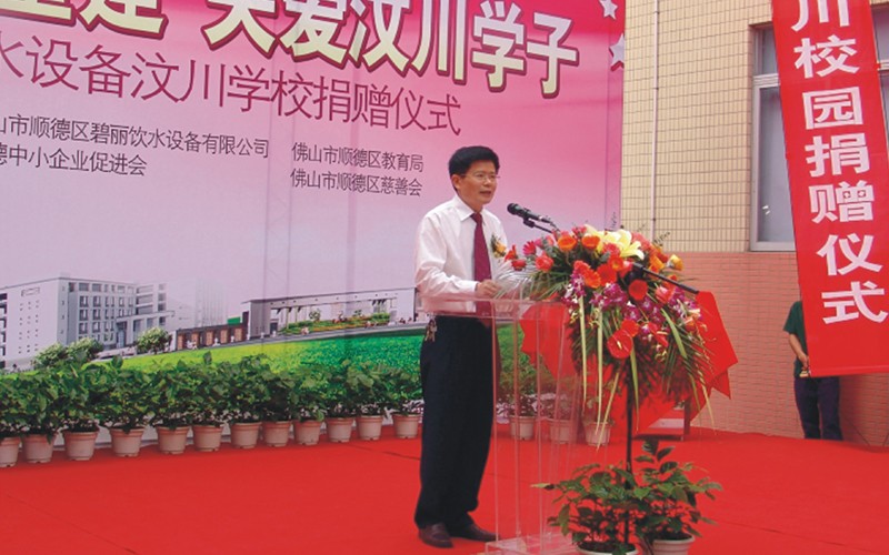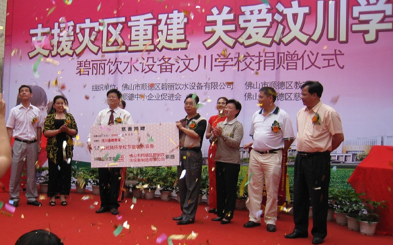 2009年4月,在汶川地震一周年之際,為了盡快幫助汶川受震災(zāi)區(qū)重建家園,讓汶川的孩子們?cè)缛栈氐阶约盒膼?ài)的校園,讓孩子們喝上健康衛(wèi)生的水,碧麗公司向汶川縣正在重建中的6所學(xué)校贈(zèng)送節(jié)能王數(shù)碼高背板飲水機(jī),為災(zāi)區(qū)的重建出一份力量,“大愛(ài)無(wú)疆,情系汶川”,碧麗關(guān)愛(ài)汶川災(zāi)區(qū)的孩子,為災(zāi)區(qū)孩子送上健康水是碧麗人的心愿。