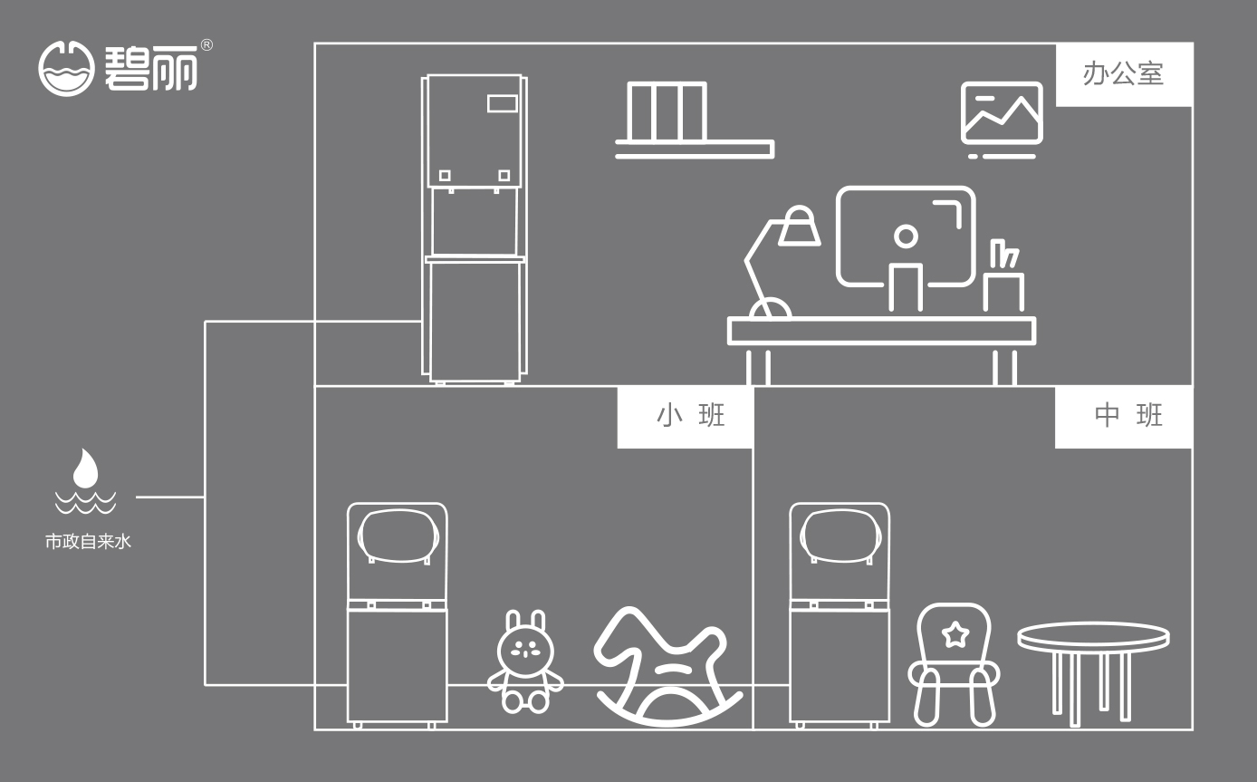 不同的飲水點(diǎn)可根據(jù)實(shí)際使用情況裝配飲水設(shè)備,如教師辦公室可安裝管線機(jī)或飲水設(shè)備或開(kāi)水器,使用戶能喝上開(kāi)水、溫開(kāi)水、純凈水等,幼兒園各班可安裝專用的幼兒園飲水設(shè)備;