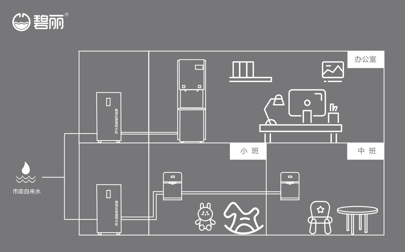 碧麗商用反滲透純水機(jī)將自來(lái)水集中處理后,把優(yōu)質(zhì)的純凈水通過(guò)專用的供水管道輸送到各飲水點(diǎn);